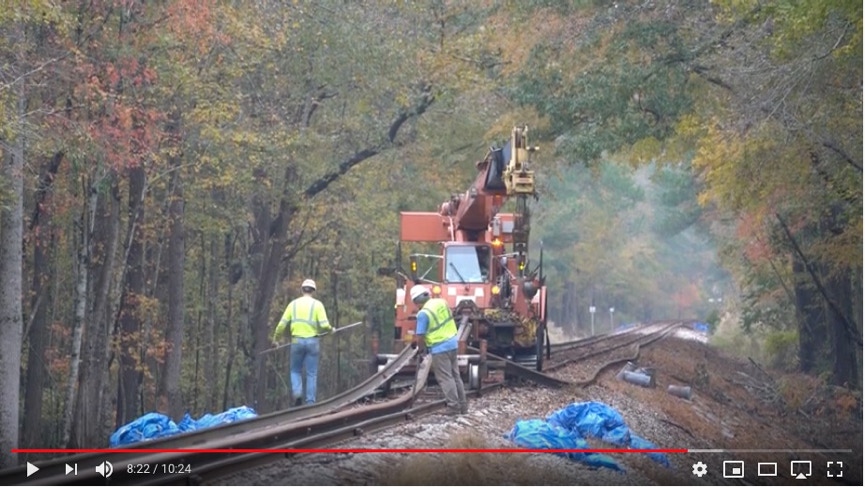 The R3 Gang is the only unit that replaces two rails simultaneously. Here is a video of the crew that takes the previously dropped ribbon rail and moves it to racks at the center of the track, positioning it to be pushed out by the “Sergeant” that will following a couple of units back. They are seen here working on the line from Chocowinity to Aurora in November 2019.