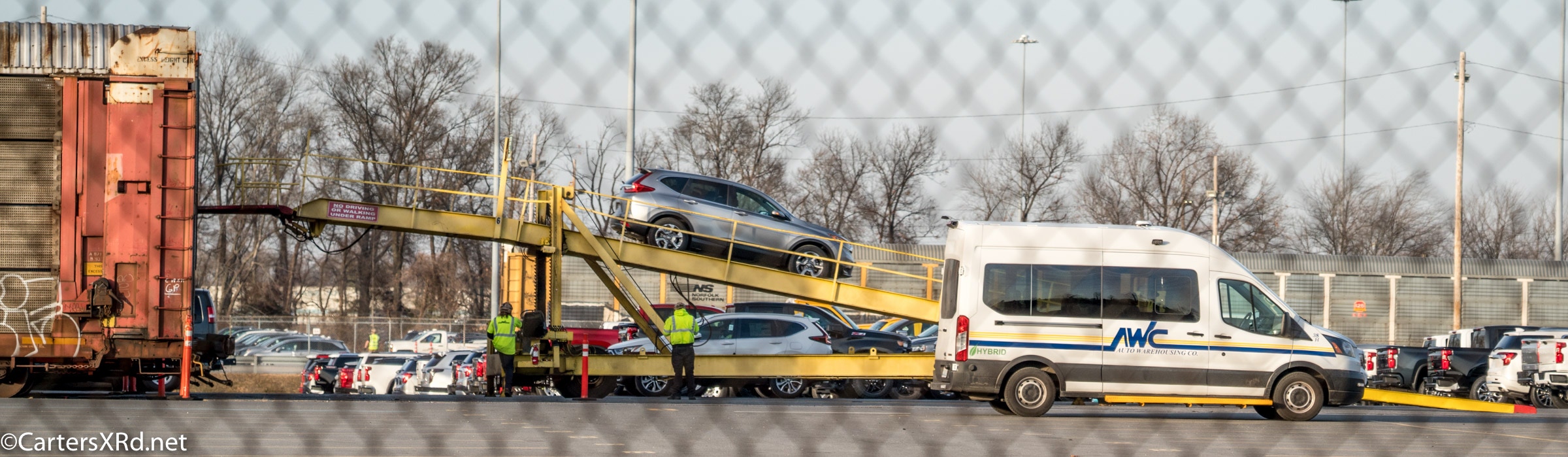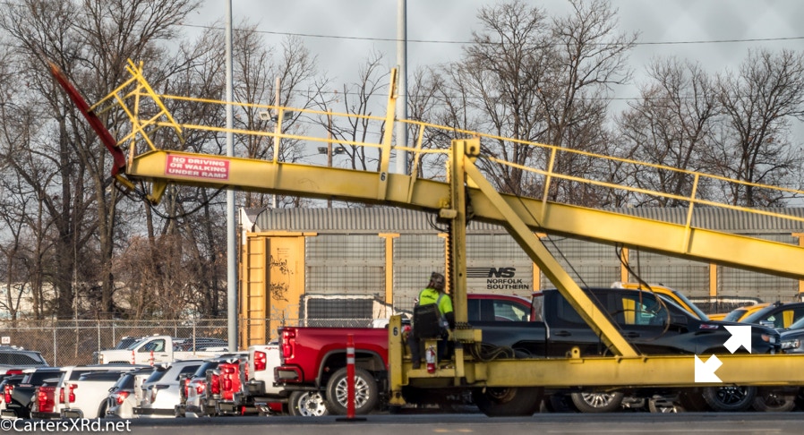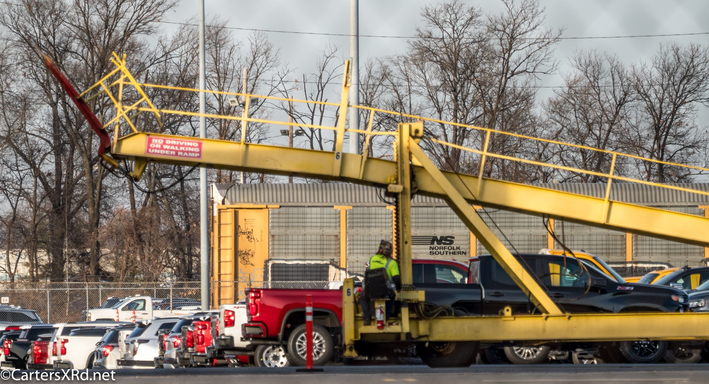 Lots of new cars, SUVs, and small trucks travel by train from the factory to delivery trucks. The large, closed rail cars carry carry vehicles stacked two high. There’s a large transfer site in Jessup, Maryland. I took these photos in December 2019.