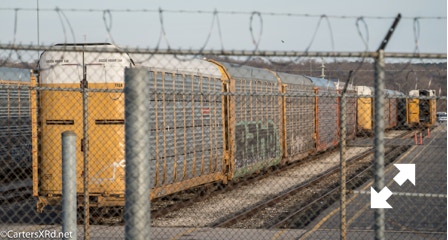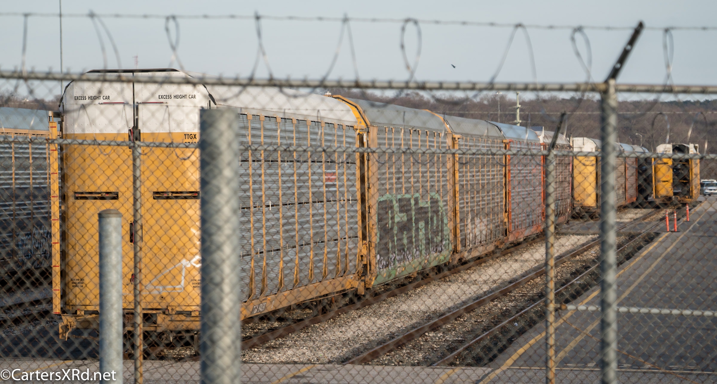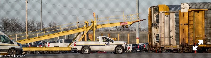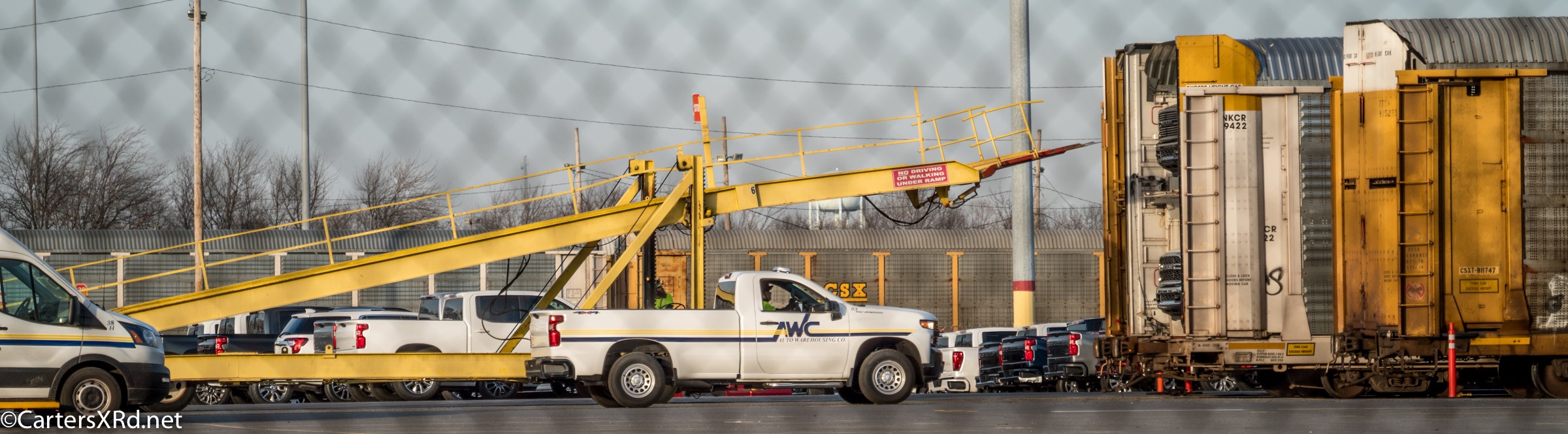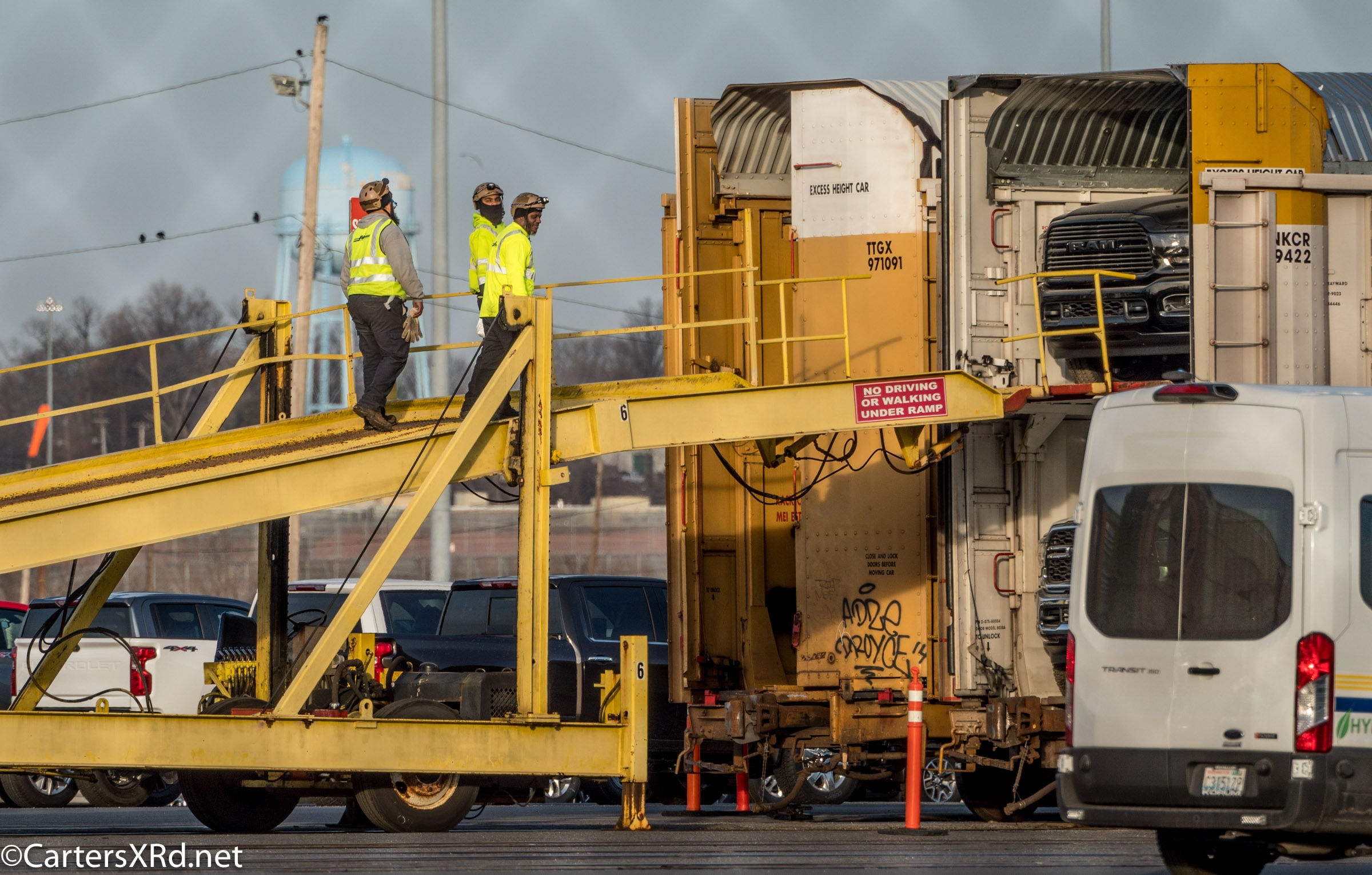 Lots of new cars, SUVs, and small trucks travel by train from the factory to delivery trucks. The large, closed rail cars carry carry vehicles stacked two high. There’s a large transfer site in Jessup, Maryland. I took these photos in December 2019.