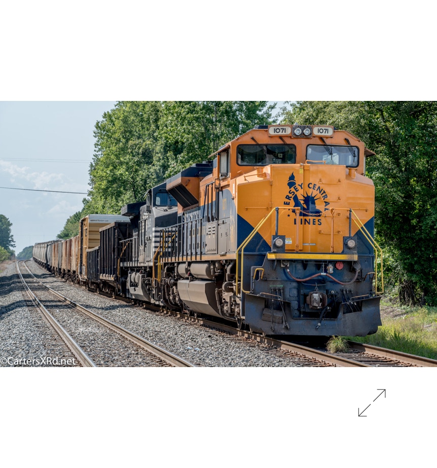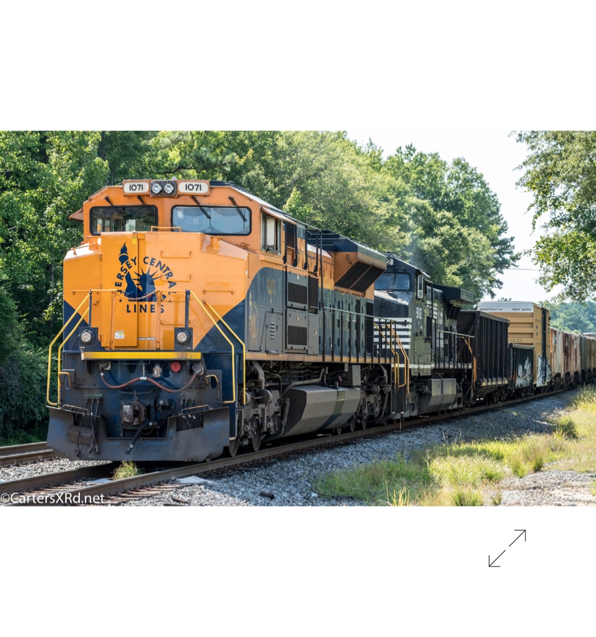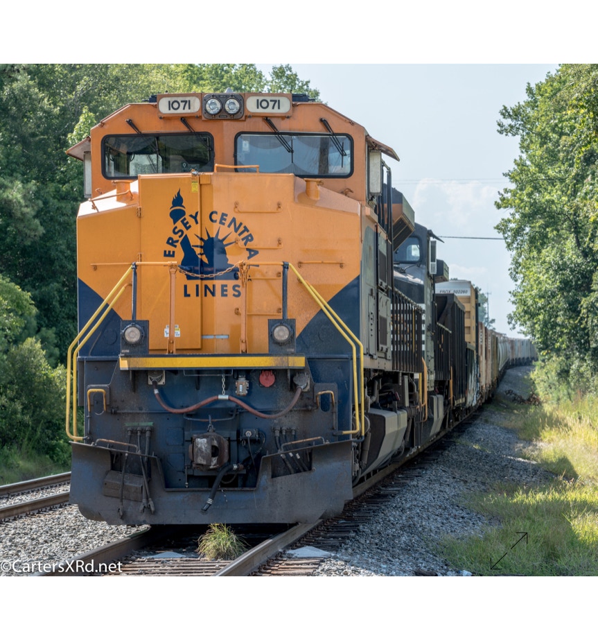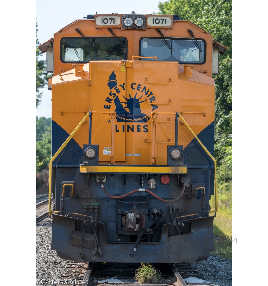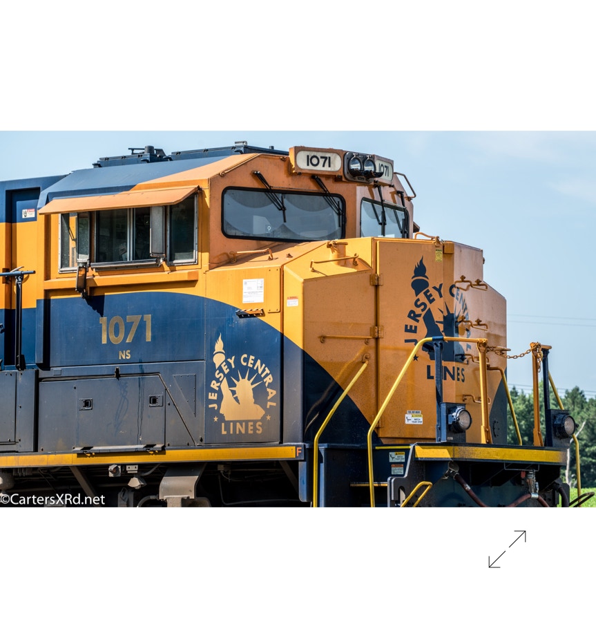 Norfolk Southern’s black and white “color” scheme can get pretty samey. But, they do have a few special paint jobs. A few years ago, they saluted the railroads absorbed into Norfolk Southern over the years. The Jersey Central Lines commemorative was in the east in July. These photo were taken on the Green Level end of Selma Yard. Jersey Central became part of Norfolk Southern by way of the Conrail acquisition. 1071 is a 2012 EMD SD70ACe.