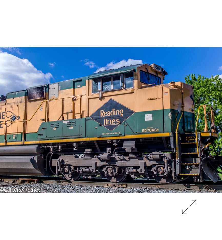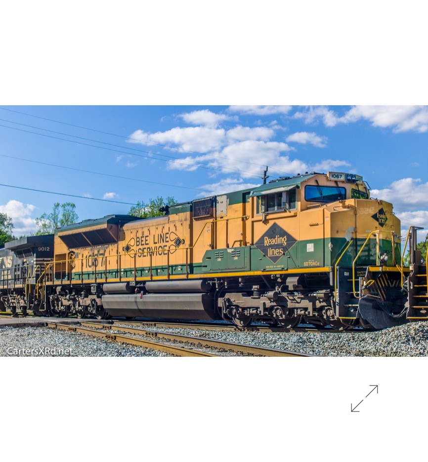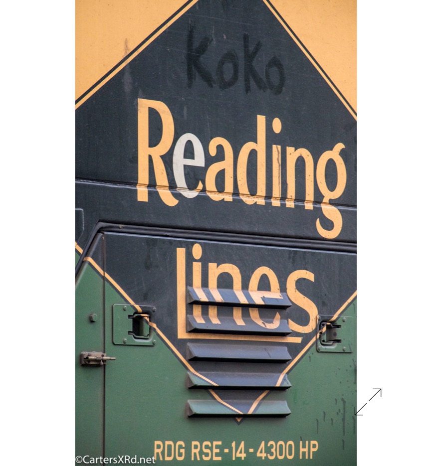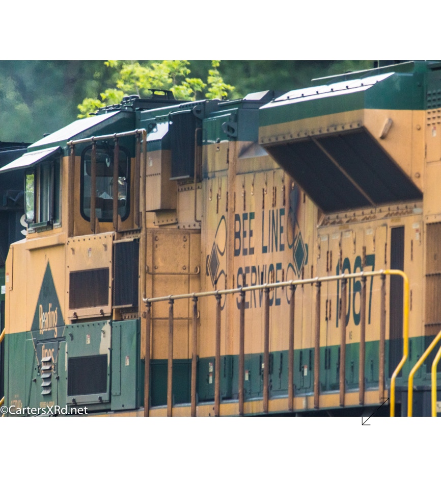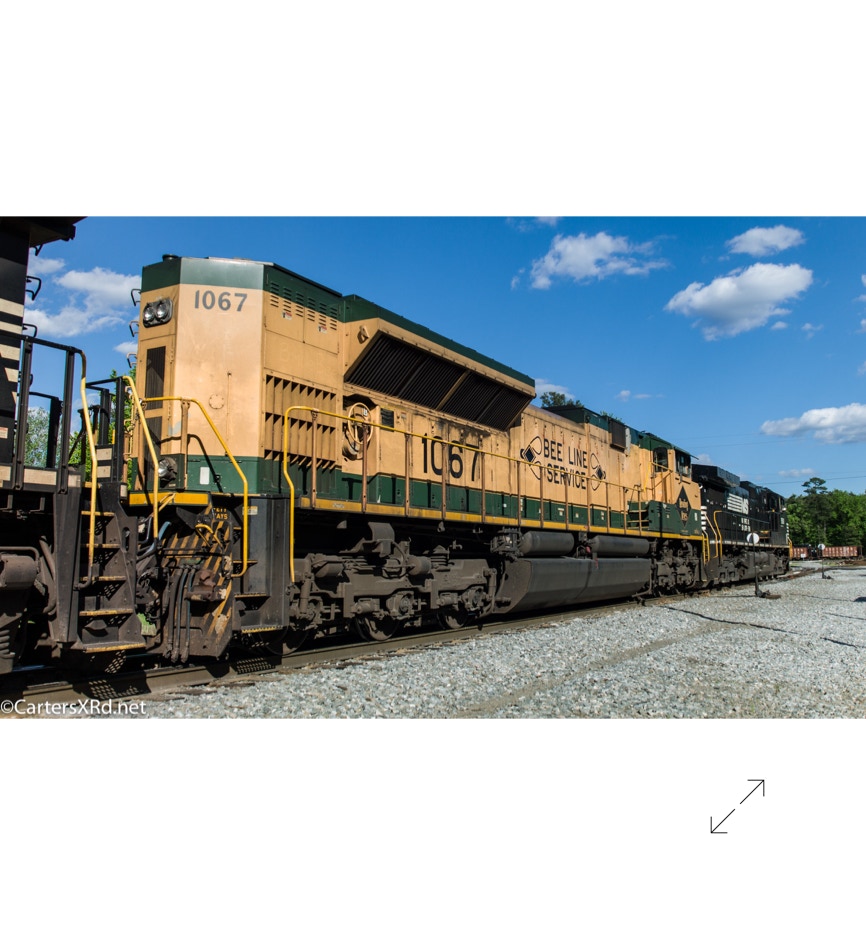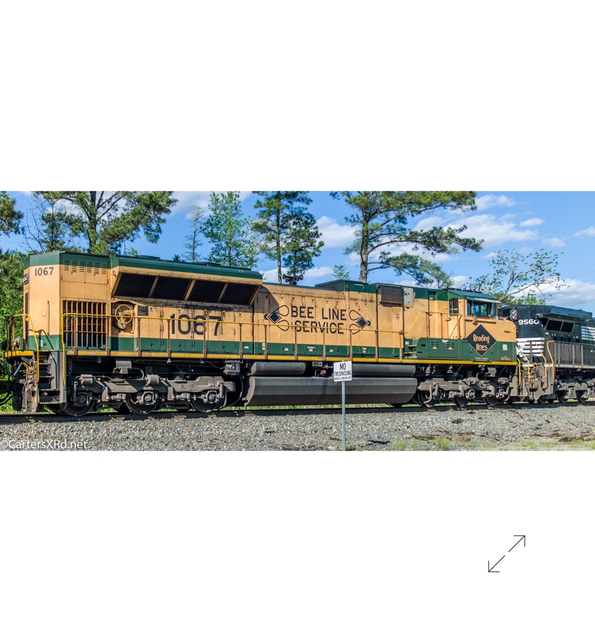 Norfolk Southern’s black and white “color” scheme can get pretty samey. But, they occasionally roll big and splurge for special paint jobs. One of those occasions is the salute they did some years ago for all the railroads which were absorbed into Norfolk Southern over the years. The Reading Lines commemorative visited Chocowinity in April. Reading became part of Norfolk Southern when they split the assets of Conrail with CSX in the 1990s. The 2012 SD70ACe carries the green and gold of Reading plus the wonderful Bee Line Service motto complete with Reading diamond bees.