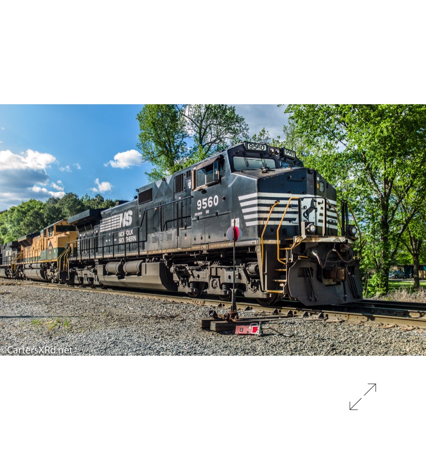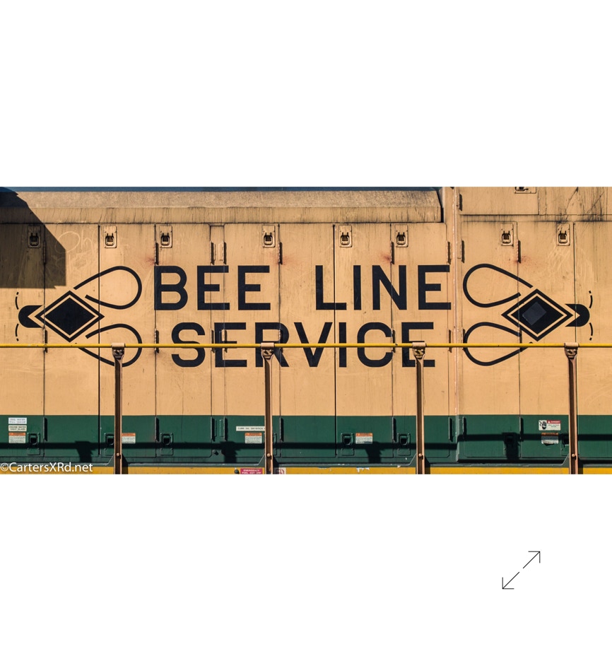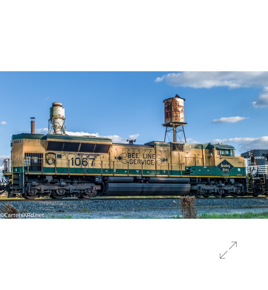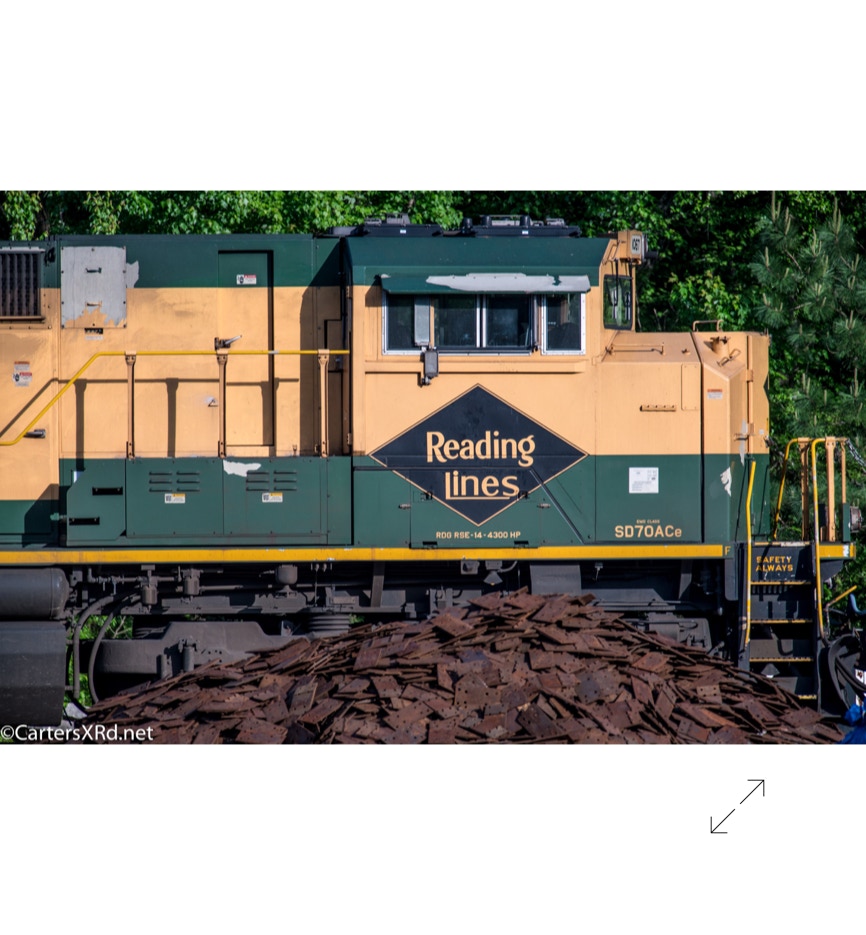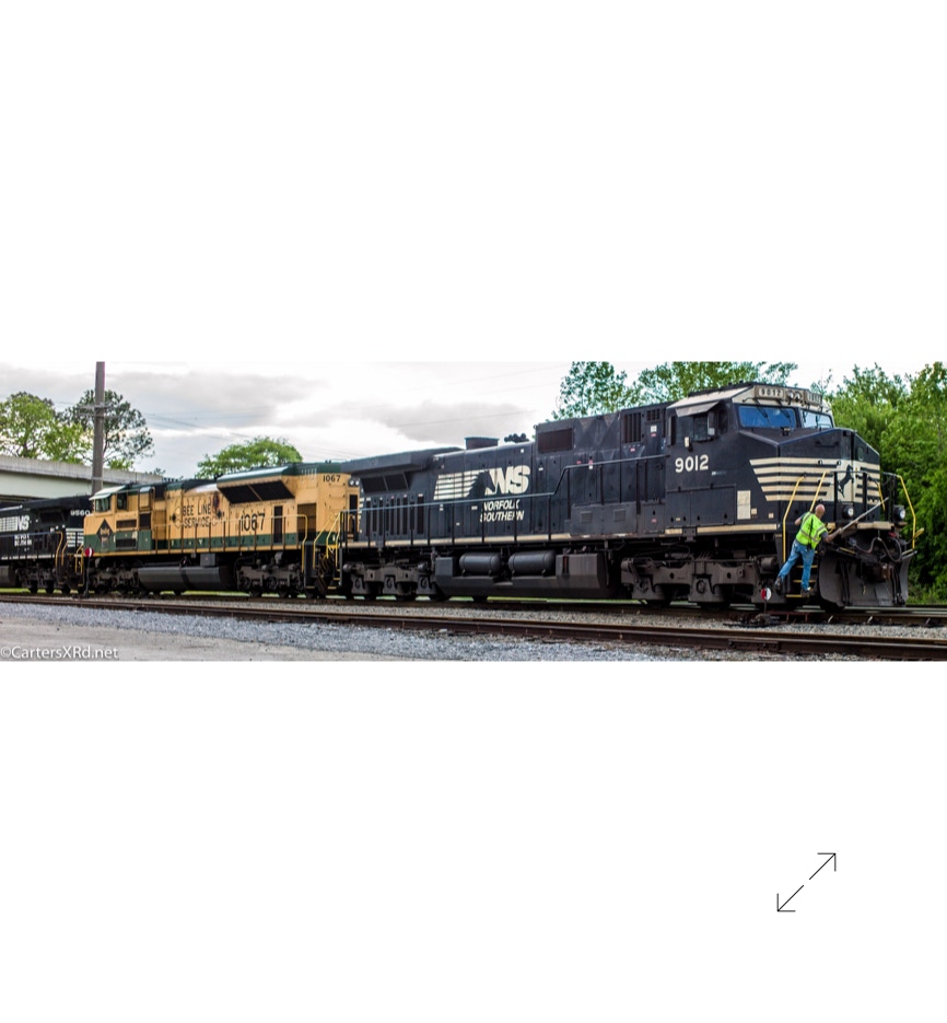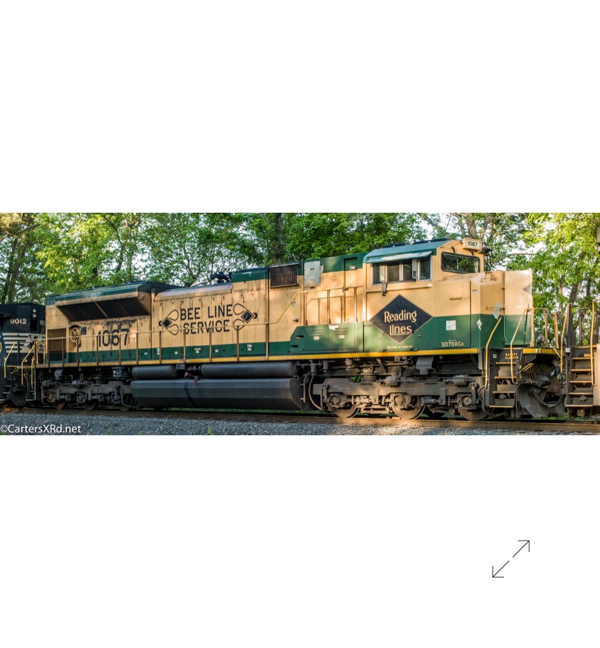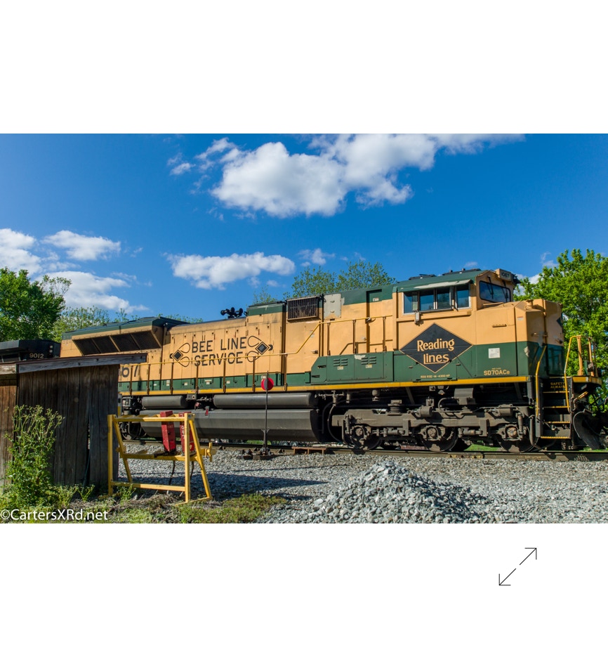 Norfolk Southern’s black and white “color” scheme can get pretty samey. But, they occasionally roll big and splurge for special paint jobs. One of those occasions is the salute they did some years ago for all the railroads which were absorbed into Norfolk Southern over the years. The Reading Lines commemorative visited Chocowinity in April. Reading became part of Norfolk Southern when they split the assets of Conrail with CSX in the 1990s. The 2012 SD70ACe carries the green and gold of Reading plus the wonderful Bee Line Service motto complete with Reading diamond bees.