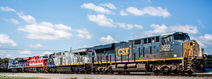 Well, some good came out of Hurricane Dorian. Kitty and I booked for Garner and a little cushion on the storm — and inconvenience for a better night’s sleep. BUT, as luck would have it, a train I had no plan or expectation of seeing came through at just a time I could make the chase CSXT X400-06. The three new fancy-paint locomotives for CSX were on their way north to some fancy party. They hardly slowed as they rolled through Selma and Micro. Thanks to friends, I knew—thanks, guys! Here are all three and their partner in the trip.